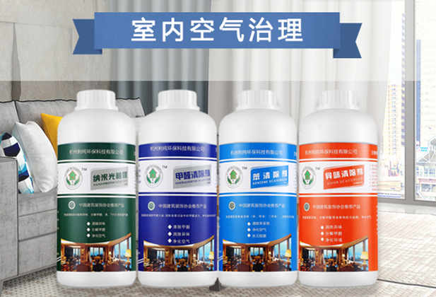 異味清除劑(生物酶)原理:利純異味清除劑產(chǎn)品原液中含有特種微生物的孢子,在有氧環(huán)境、溫度、濕適合的條件下,原液噴涂到基材表面后,其中的孢子會轉(zhuǎn)變?yōu)樘胤N微生物,微生物有強(qiáng)大的繁殖能力,通過自身繁殖產(chǎn)生生物酶,并能分泌一定的活性酶,在微生物和酶的雙重作用下,能把基材中能揮發(fā)出來的甲醛、苯、氨、TVOC等有害氣 體物質(zhì)分解為無毒無害的二氧化碳(CO2 )、水(H2 O)、二氧化氮(N02 )等 物質(zhì),能從污染源頭祛除醛類、苯類等有機(jī)污染物及異味,達(dá)到凈化空氣的目的。