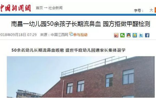 據中國新聞網報道, 9月17日,剛剛開學不久,由香港YM教育集團投資創(chuàng)辦的南昌經開區(qū)奧克斯盛世華庭幼兒園遭到家長集體退學。家長們告訴記者,該幼兒園園開學一年來,已有50名幼兒頻繁流鼻血、咳嗽。家長們都懷疑是學校甲醛超標引起的,但是園方卻拒不配合檢測,且處理態(tài)度十分惡劣。出于對孩子健康的擔憂,幾十名家長不得不讓孩子退學。